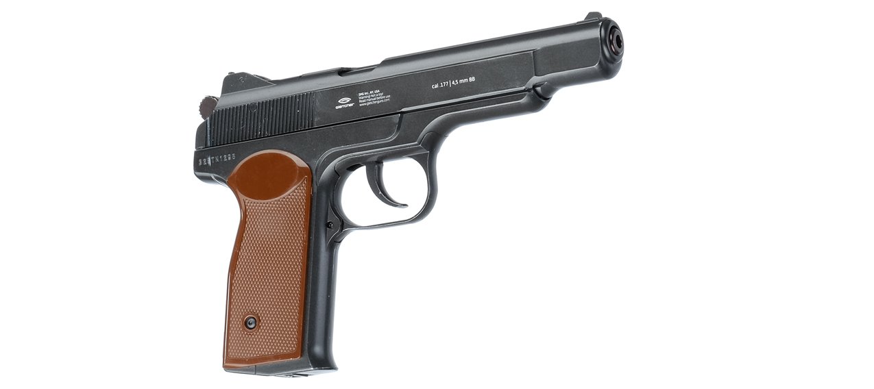The frame is made of metal alloy with aluminum. The weight is 885 grams. The lithium battery (800 mAh) gives you 10 hours of comfortable game. The length of the pistol is 22.5 centimeters – like in the original combat prototype.